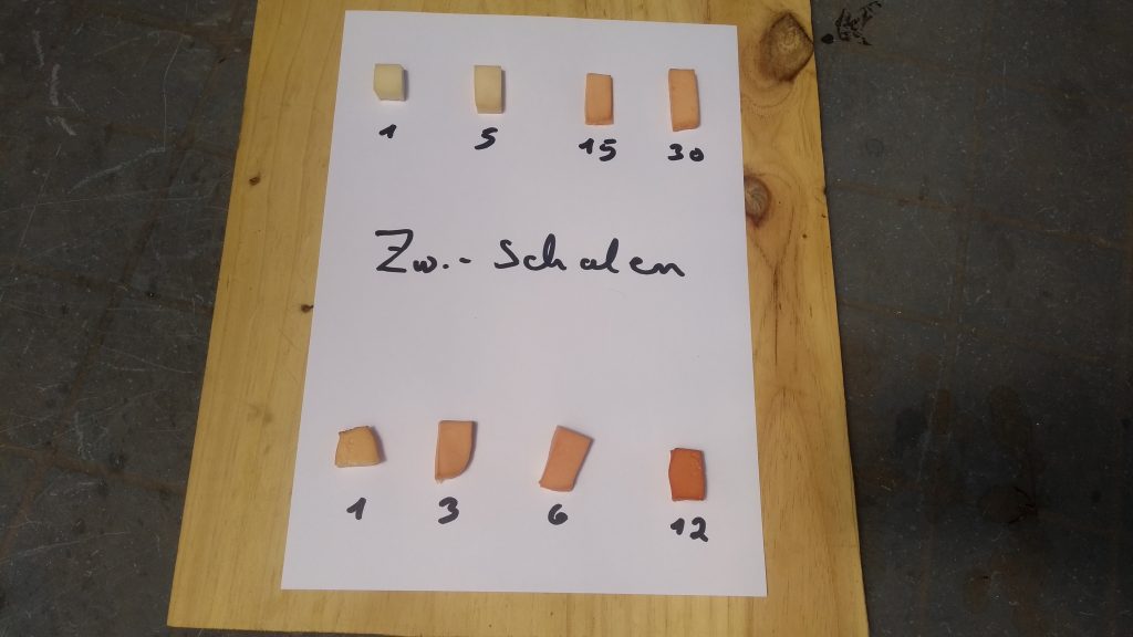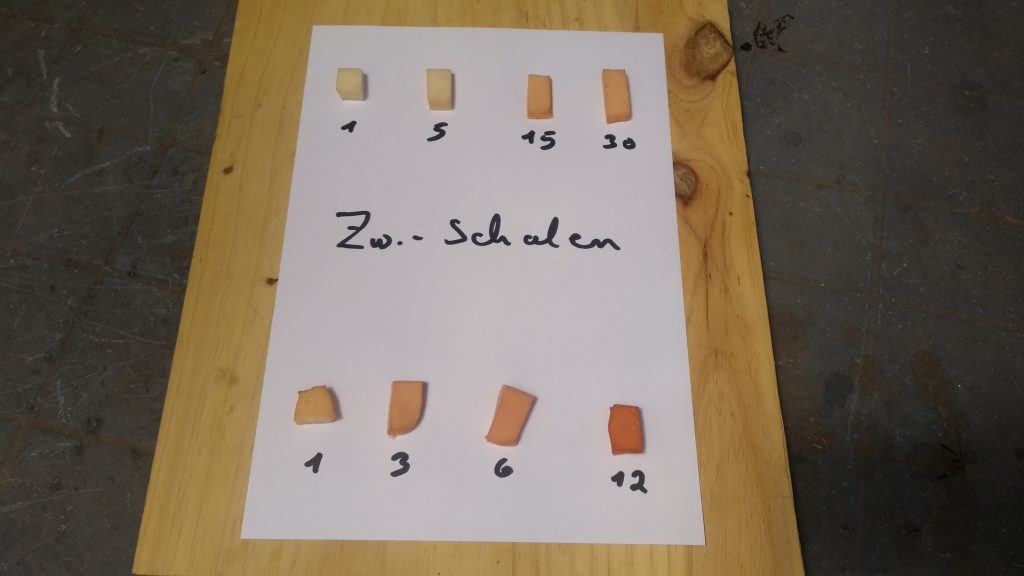 Hier siehst du, wie sich Eiweiß bei unterschiedlichen Einwirkzeiten färbt. Für diesen Test wurden Zwiebelschalen in heißem Wasser ausgekocht und das Eiweiß anschließend darin eingelegt.