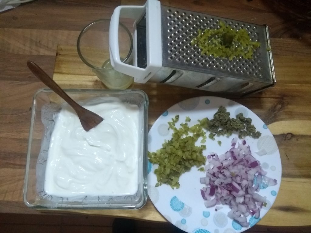 – Zwiebel, Gewürzgurken, Kapern und Petersilie zum Joghurt geben.