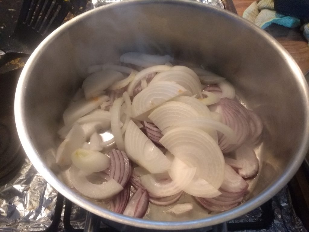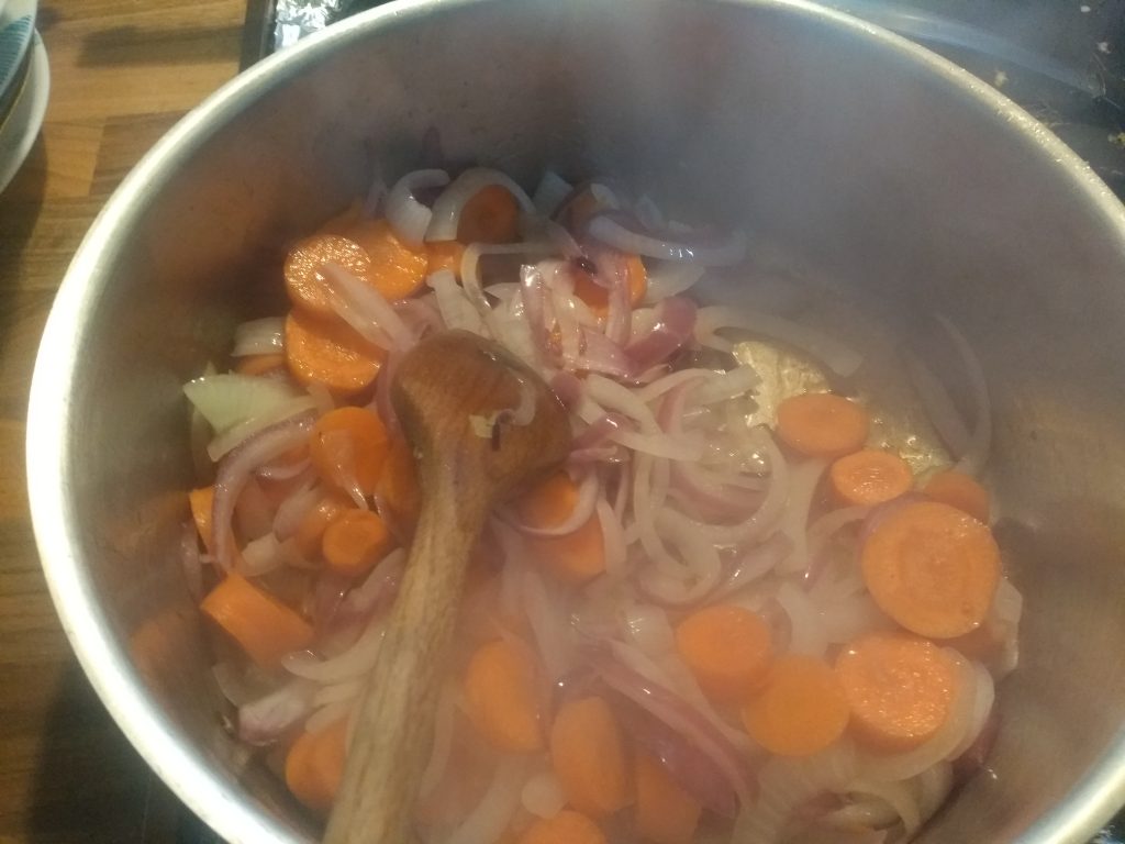 – In einem großen Topf das Öl erhitzen und die Zwiebeln darin kräftig anbraten, bis sie leicht gebräunt sind.