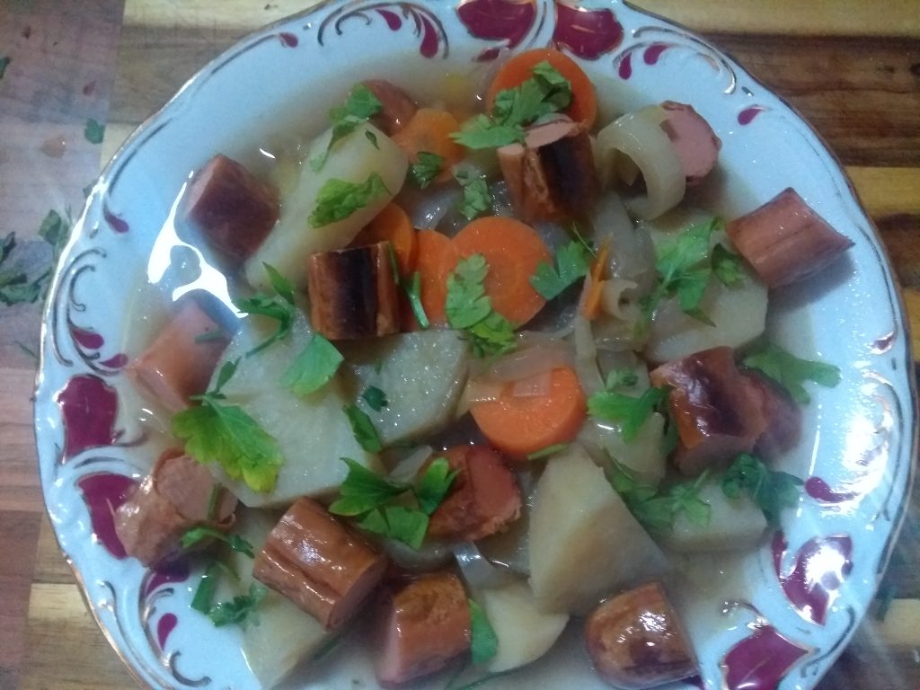 weich gekochte Kartoffeln auf kräftiges Gemüse und aromatische Geflügelwürste