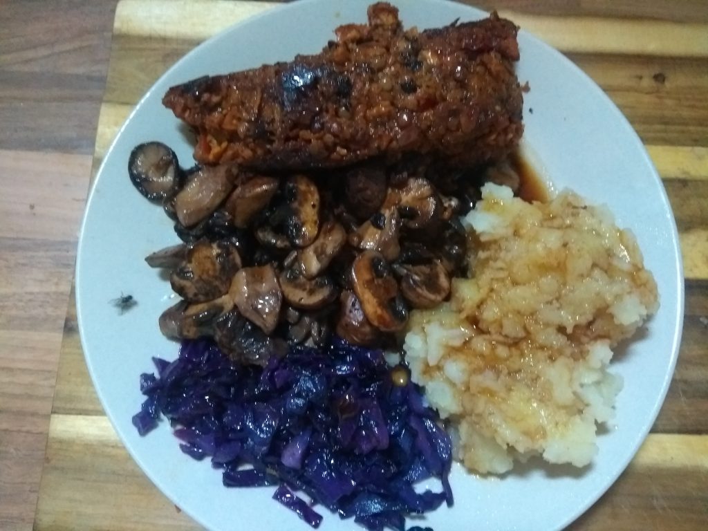 Das Gericht eignet sich ideal für die Feiertage, besonders wenn Gäste kommen: Der Linsenbraten lässt sich hervorragend vorbereiten, im Kühlschrank durchziehen und schmeckt am nächsten Tag sogar noch intensiver. Zusammen mit einer geschmorten Pilzpfanne und fluffigen veganen Klößen entsteht ein festliches Menü, das satt macht, wärmt und trotzdem leicht bleibt. Perfekt für Heiligabend oder ein gemütliches Familienessen.