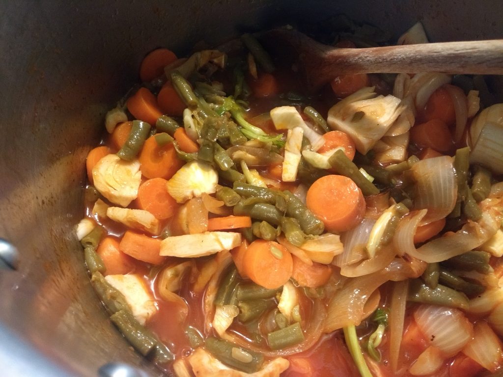 Jetzt mit Wasser oder Gemüsebrühe aufgießen, sodass das gesamte Gemüse gut bedeckt ist.