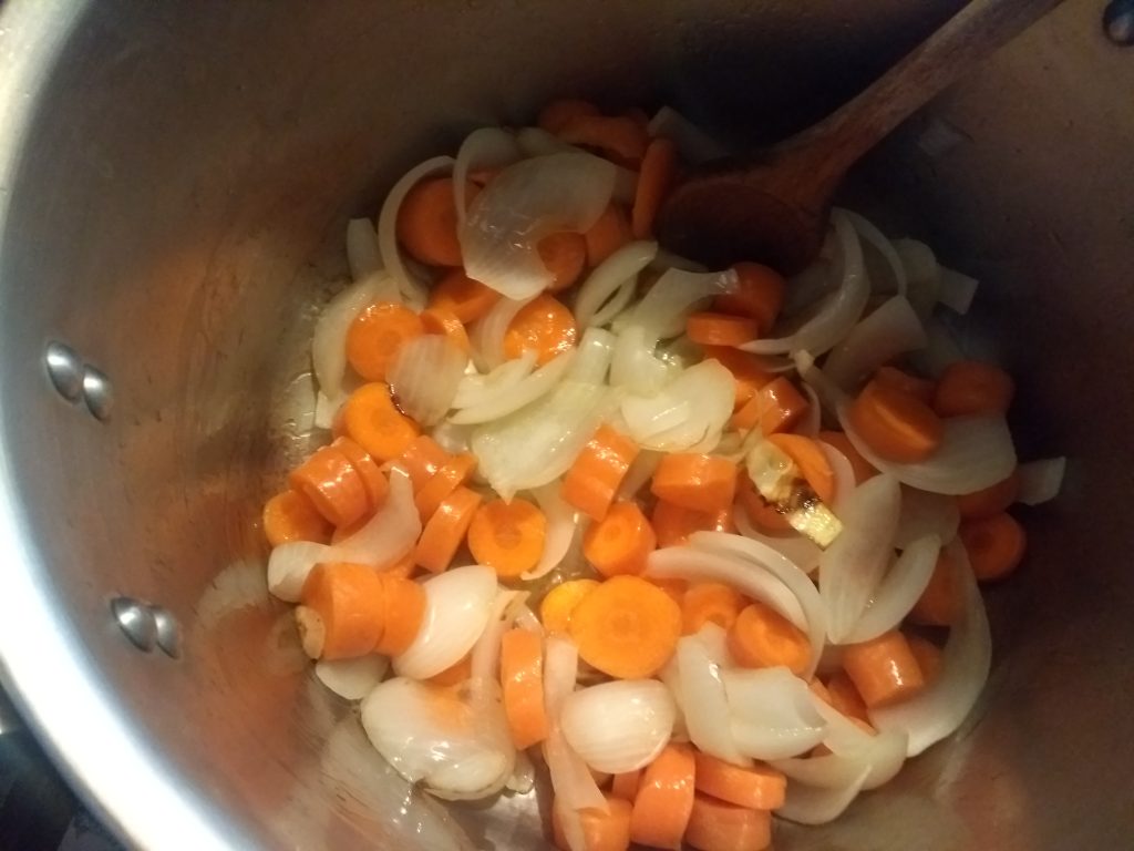 und leicht dunkel anbraten. Die Karottenscheiben hinzufügen und einige Minuten mitbraten,