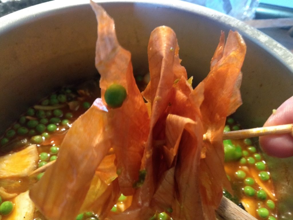 Sobald Karotten (und ggf. Kartoffeln) butterzart weich sind, die Zwiebelschalen aus der